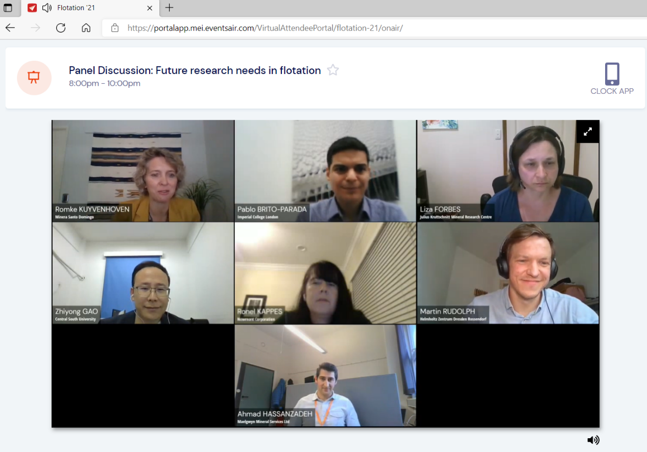 11月8日至12日,第十届国际浮选大会(Flotation ‘21)顺利召开。由于新冠疫情影响,来自29个国家的267名代表,通过线上形式参加了为期五天的会议。大会设有12个分论坛,来自22个国家的代表共作了105个学术报告(其中两个Keynote),涵盖浮选气泡与泡沫、硫化矿浮选药剂、铂族金属(PGM)浮选药剂、细粒浮选、浮选模型与模拟、浮选过程控制与装备、浮选流程与生产实践等多个浮选领域。中南大学共有5名代表注册参会并作4个会议报告(其中包括两名硕士研究生)。