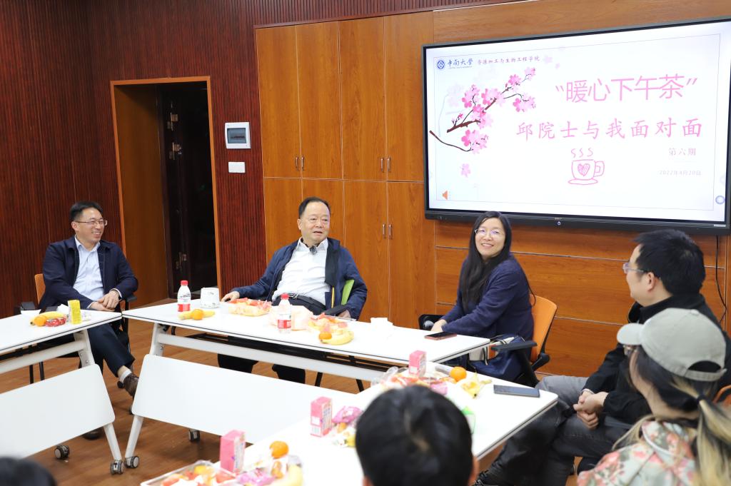 为提高学生学习热情、点燃学生科研热情、提高学生科研素养、营造浓厚的科研氛围,2022年4月20日,我院第六期“暖心下午茶”座谈会在生物楼101举行。中国工程院院士邱冠周、资生院党委书记范晓慧、副书记朱忠平、副院长王军出席本次活动,与同学们进行“零距离”交流。