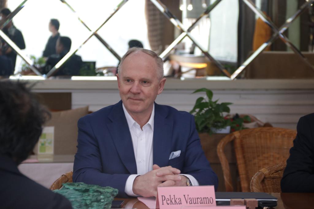 的学生代表举行了面对面座谈。Pekka Vauramo先生针对环保、学生未来发展和专业学习等方面问题提出了自己的看法。Pekka Vauramo认为,美卓公司高度重视环保,在环保的前提下满足客户的需求,尽可能保证产品生产效率,并且环保于可持续发展也符合中国对于企业发展的要求。他也提到在学生的未来职业发展中,应当尽力找到自己感兴趣的方向,不受他人看法的影响,脚踏实地做,并持续为之努力。希望同学们都能够有自己的理想,一步一个脚印地去做好。