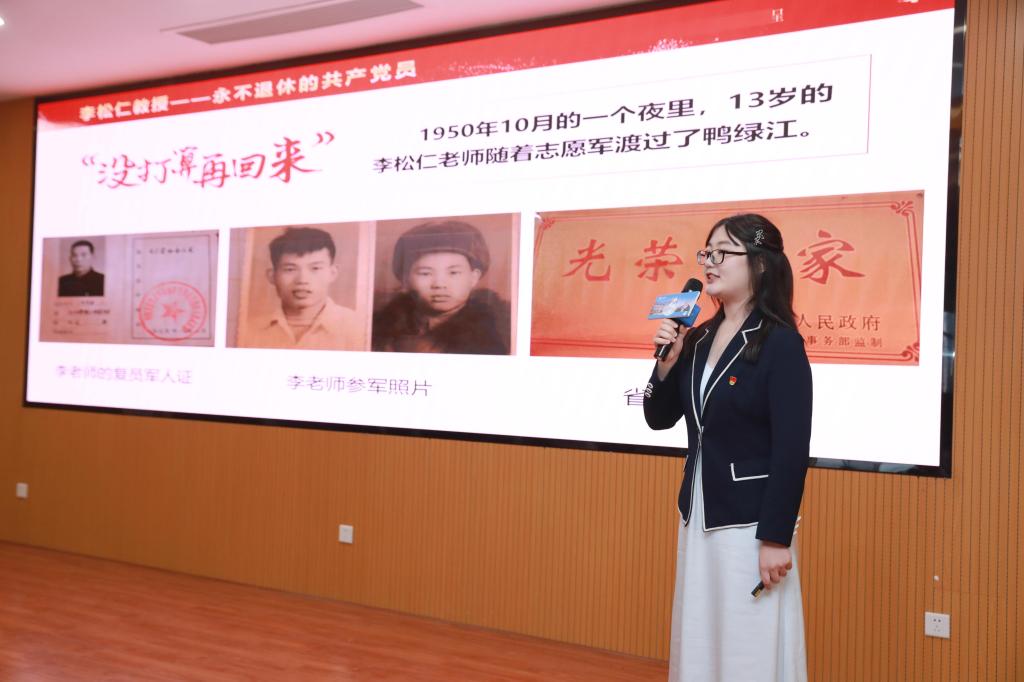 “‘平生虽无鸿鹄志,甘做人梯铺路石’,从年仅13岁加入志愿军参加抗美援朝,到‘站出来让祖国挑选’,成为永不退休的共产党员是李松仁教授的决心。”宣讲团成员深情地讲述了中南人在时代浪潮中挺膺担当的鲜活故事。当今时代的青年接笔续写:坚守钢铁冶金行业一线,是全国五一劳动奖章获得者聂绍昌的真实写照;“我将无我,不负韶华”是情系新疆阿拉哈格基层的小代书记对老百姓们许下的承诺;“世界以痛吻她,而她抱之以歌”,是中南校友吴思“献身”母校,对于母校超越生死的眷恋。