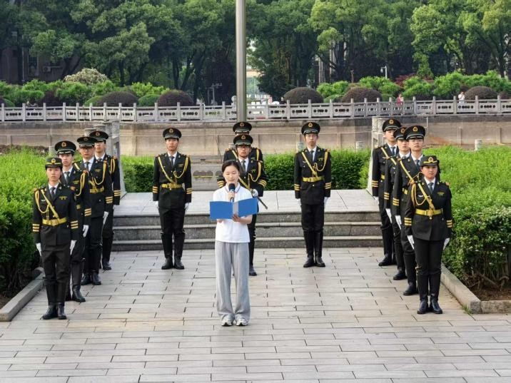 晨光初露,全体师生整齐列队,肃立注目。国旗护卫队迈着铿锵有力的步伐护送国旗入场。伴随着雄壮的《义勇军进行曲》,五星红旗冉冉升起,在场师生齐唱国歌,面向国旗行注目礼,现场气氛庄重而激昂。